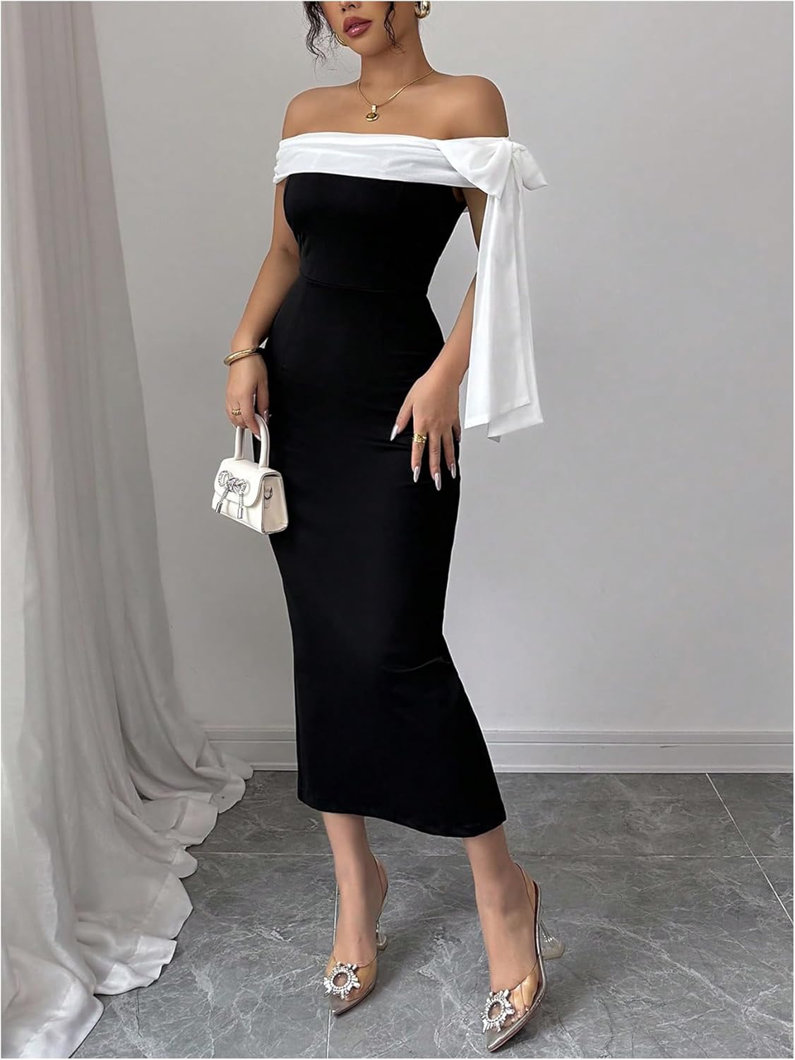This off-the-shoulder bodycon maxi features a bow-tie neckline that adds a soft, feminine focal point. Elegant without feeling precious, it balances formal polish with fashion-forward appeal.